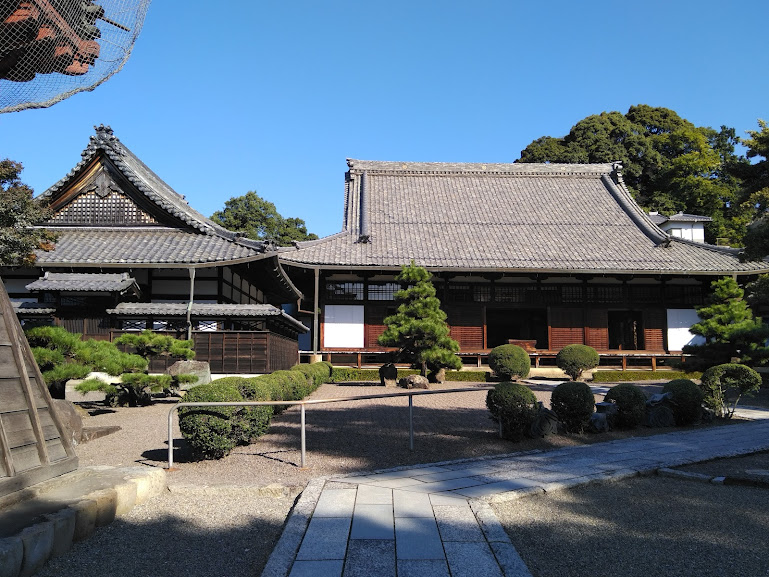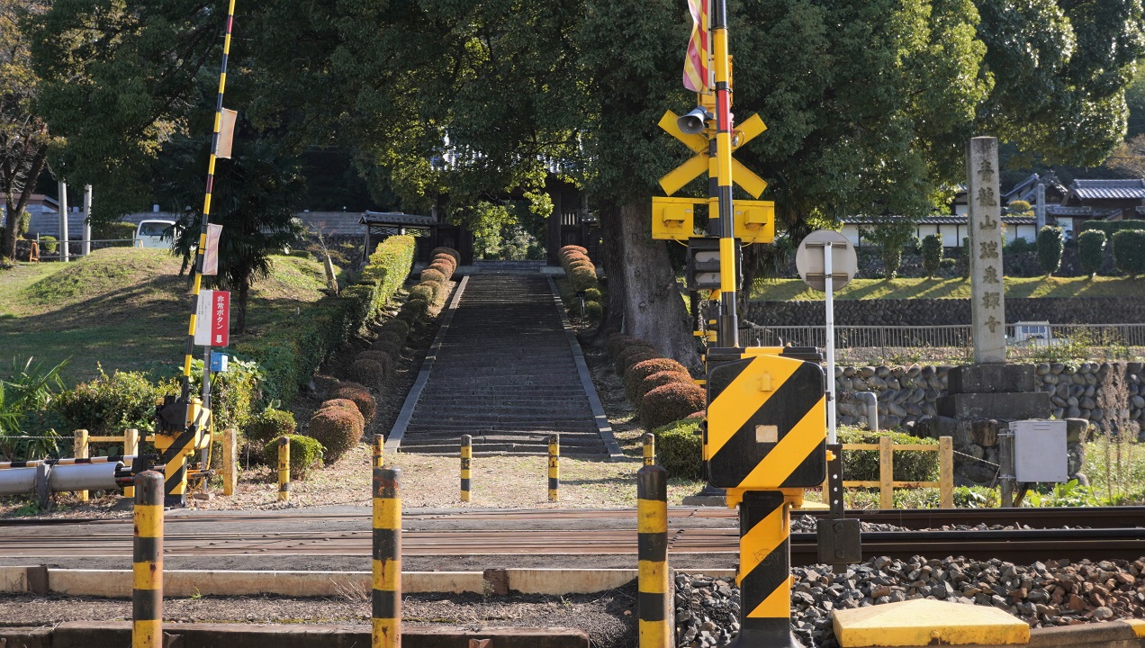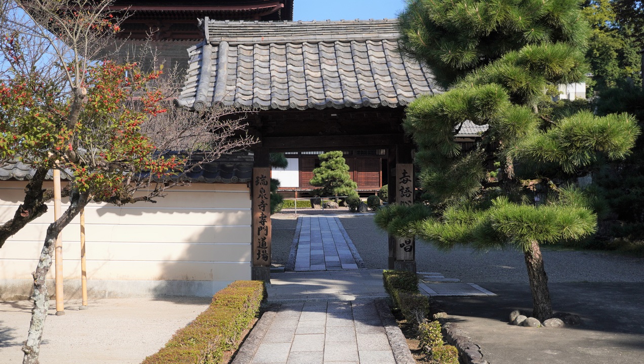瑞泉寺の山門は、成田山・名古屋別院・大聖寺の西側にあります。現在は名鉄・犬山線の線路が、参道を横切る形で走っています。