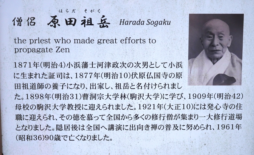 発心寺の住職をつとめた原田祖岳(はらだ そがく)禅師は、20歳の時に臨済宗・正眼寺(しょうがんじ)で禅を学んで見性しました。只管打坐、修証一如の曹洞禅の僧侶が、公案を用いて指導をするのは珍しく、臨済・曹洞の折衷派と言われました。