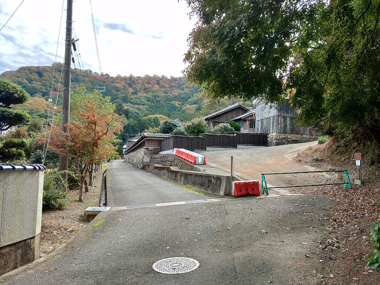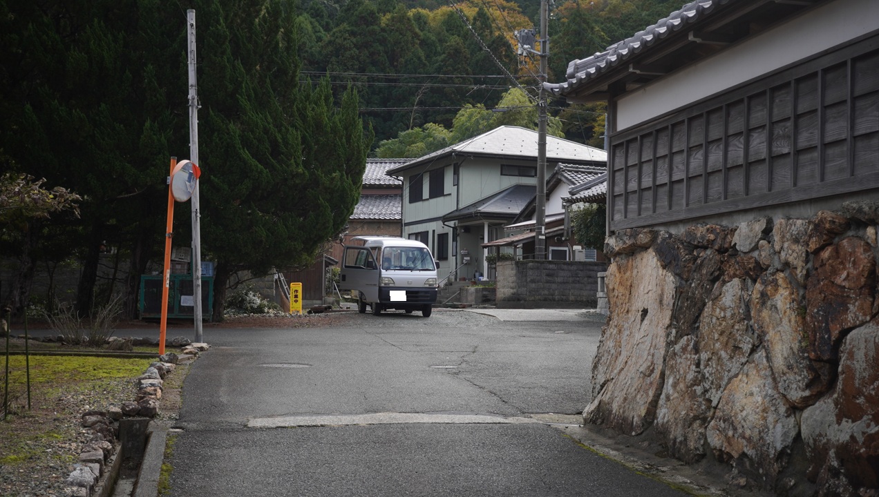 下見板(したみ いた)張りの塀を、右に曲がります。
